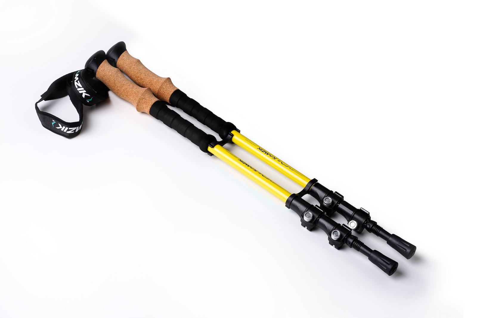 Teleskopické 3-dielne trekingové palice s anatomickou rukoväťou z mletého korku a zaťahovacím pútkom na zápästie.